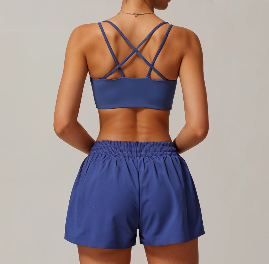 Embrace effortless movement with our strappy yoga set, featuring a chic criss-cross back sports bra and breathable lightweight shorts. Designed for style and comfort, this set offers a supportive fit with 4-way stretch fabric and a relaxed, elastic waistband. Perfect for yoga sessions, workouts, or lounging, it keeps you feeling confident and comfortable all day long.